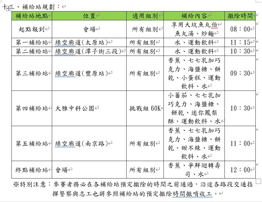 **特別注意:參賽者務必在各補給站預定撤除時間前通過,沿途各路段交通指揮警察與志工也將參照補給站撤哨收工。 |